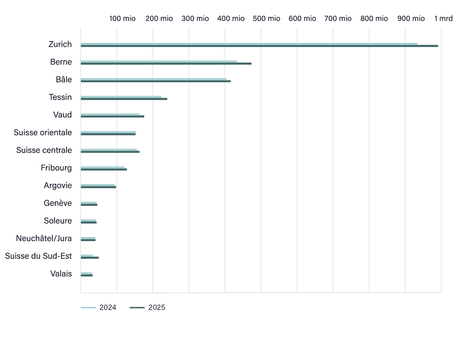 Nombre d’entreprises membres et filiales2024:1332025:130Nombre de collaborateurs2024:24002025:2626Taille moyenne des entreprises (nombre moyen de collaborateurs par entreprise)2024:18.042025:20.20Chiffre d’affaires brut des entreprises membres, par région (en millions de CHF)2024:4332025:474 -
